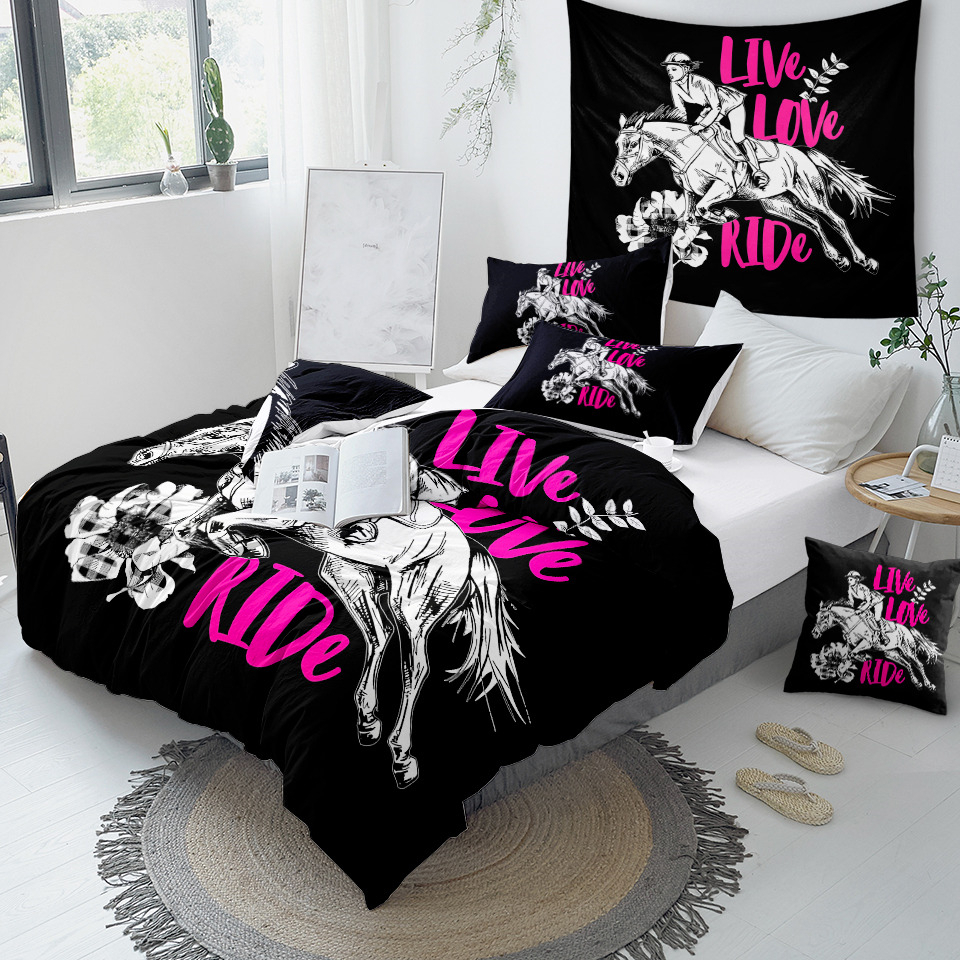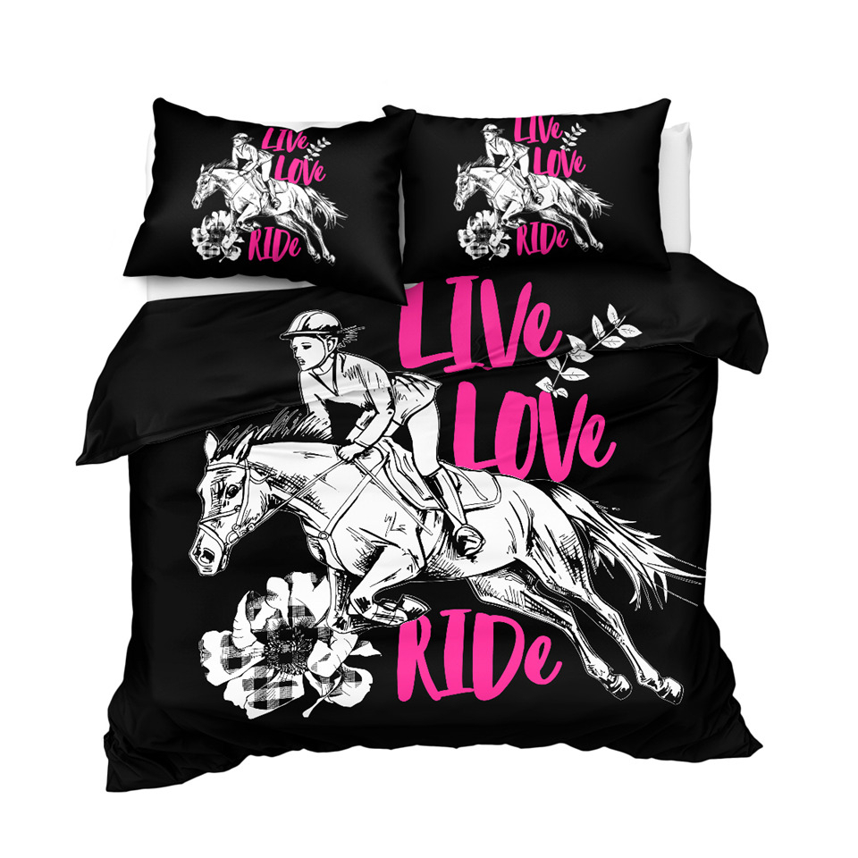 Cette parure de lit à motifs chevaux noir “Live Love Ride “ est le choix idéal pour ceux qui veulent apporter une touche élégante et unique à leur chambre.