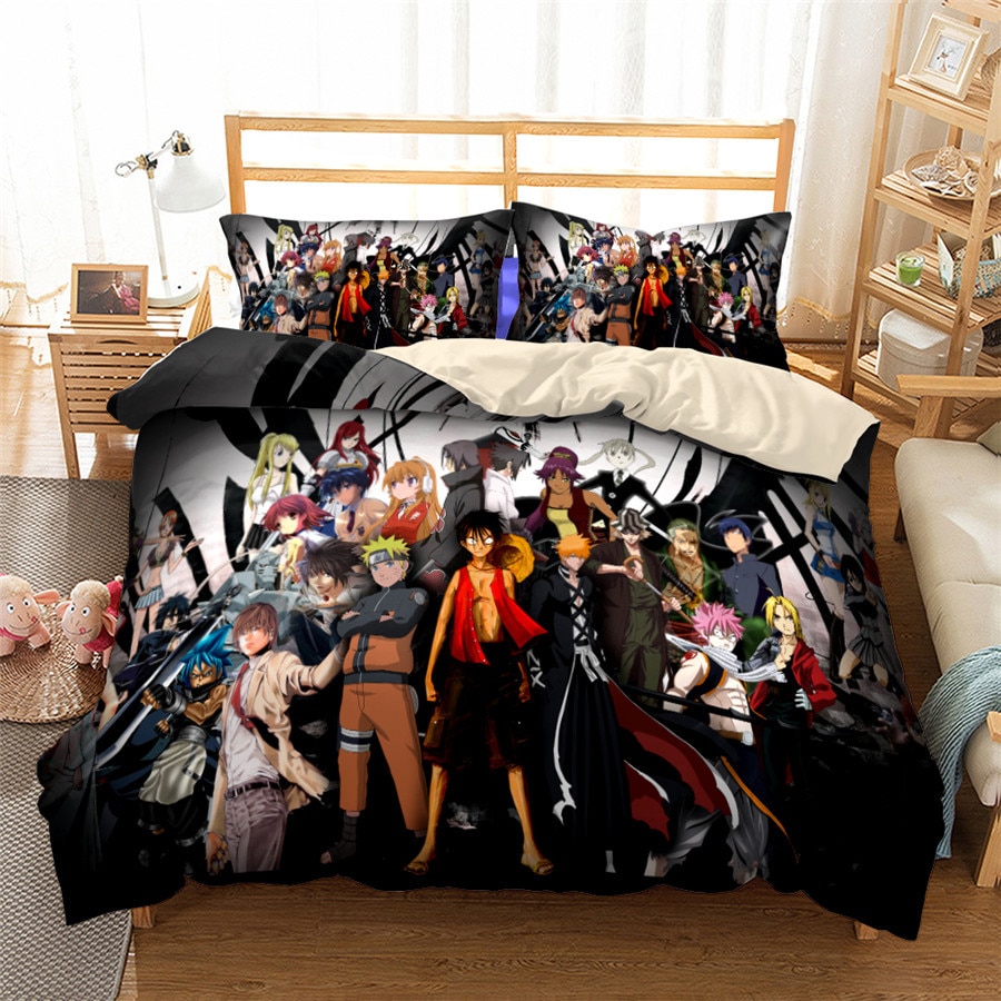 Parure de lit à motif personnages de mangas. Bonne qualité, confortable et à la mode sur un lit dans une maison