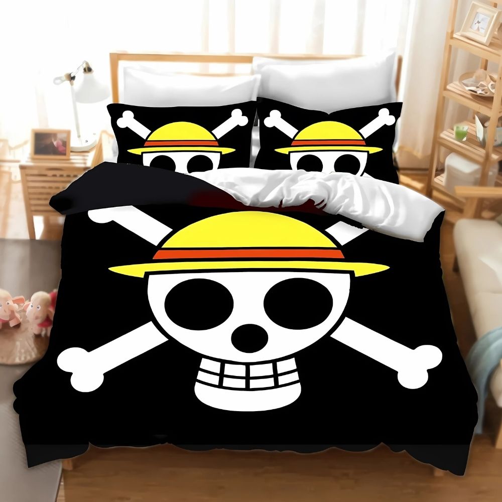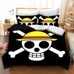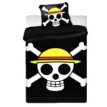 Affichez votre passion pour One Piece directement dans votre chambre grâce à cette parure de lit iconique. Son design unique met en valeur le célèbre logo du manga, sur un fond noir élégant qui s’intègre parfaitement à tout style de décoration.