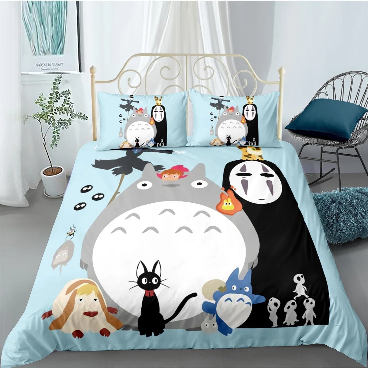 Notre parure de lit est conçue pour offrir une expérience de sommeil confortable et agréable, tout en apportant une touche de magie et de douceur à votre chambre. Elle est composée d’une housse de couette et de deux taies d’oreiller assorties, toutes ornées de magnifiques illustrations représentant Totoro, le personnage principal du film, ainsi que ses adorables amis.