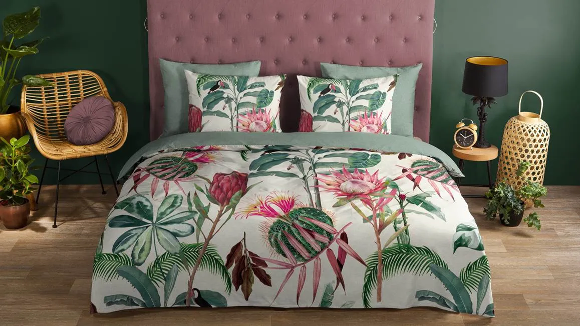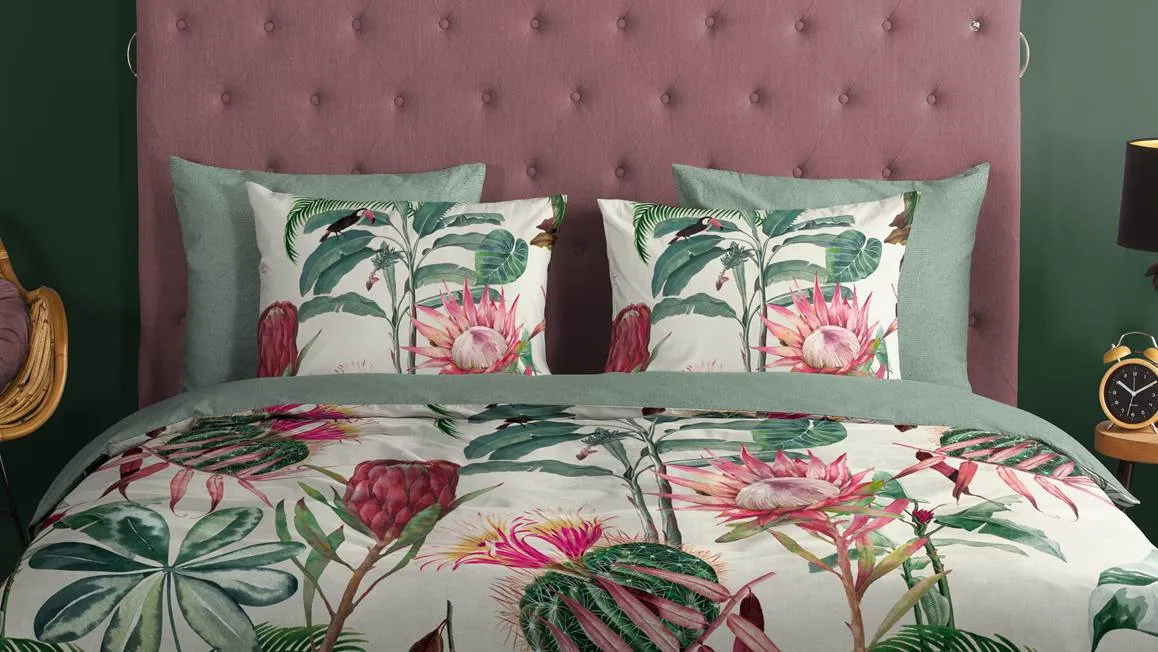 Le motif tropical est un véritable enchantement pour les yeux. Les feuilles vertes, les fleurs exotiques et colorés créent une ambiance tropicale rafraîchissante et relaxante. Les couleurs douces et naturelles du beige ajoutent une touche d’élégance et s’harmonisent parfaitement avec n’importe quel style de décoration de chambre.