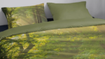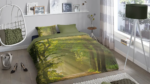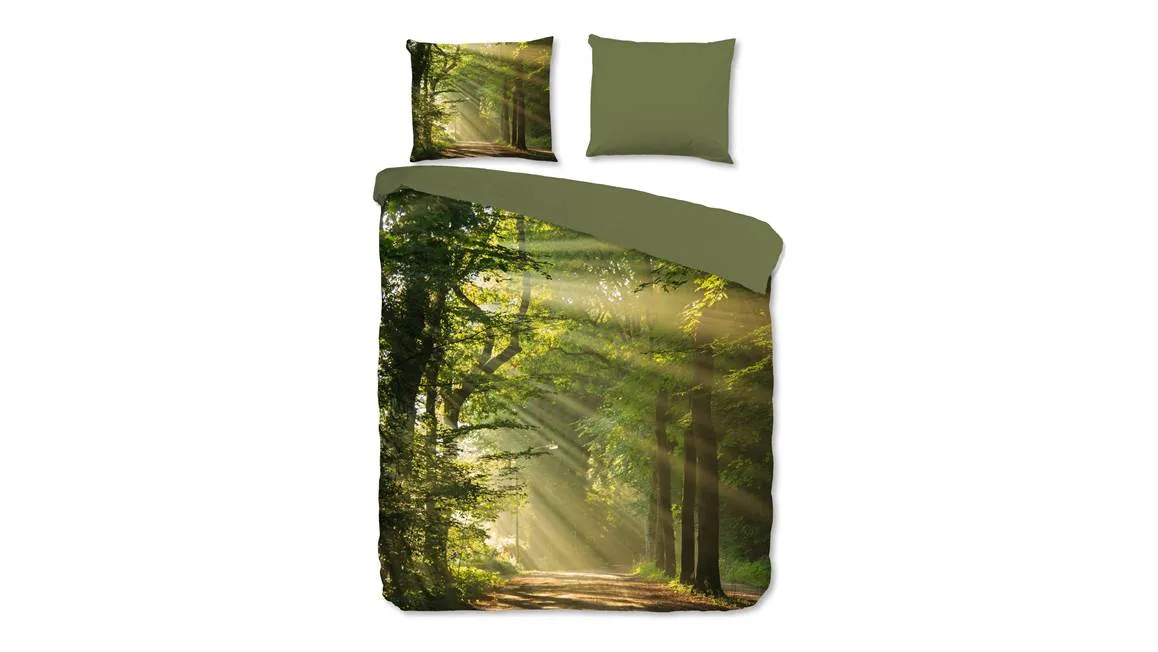 L’ensemble comprend une housse de couette ainsi que deux taies d’oreiller assorties, tous ornés d’un motif détaillé représentant une forêt dense et majestueuse. Les nuances de vert profond, de marron terreux évoquent la richesse des arbres, des feuilles et des fleurs qui peuplent cet environnement enchanteur.