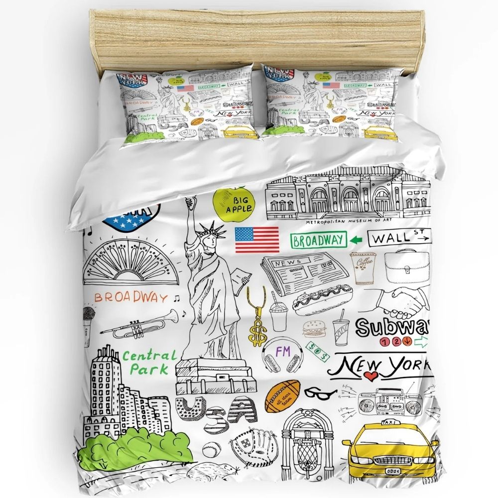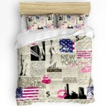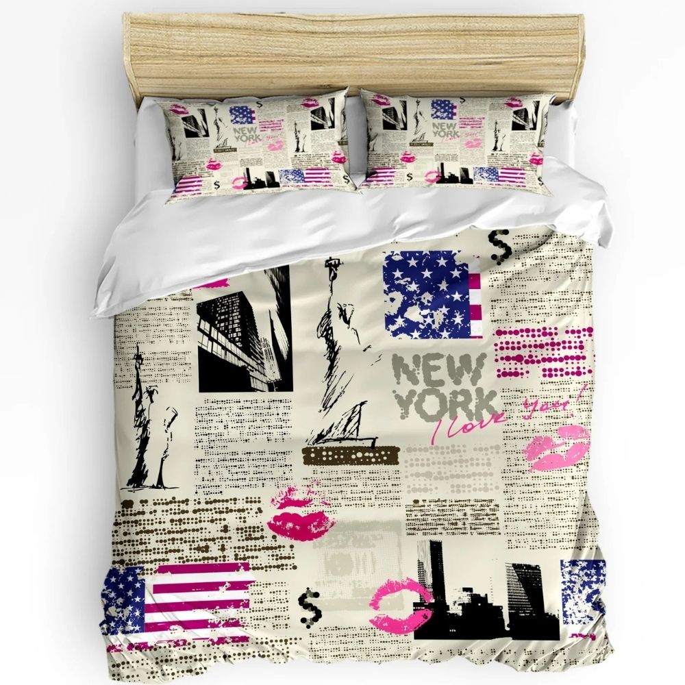 Cette parure minimaliste capture l’essence de New York avec des motifs épurés de la Statue de la Liberté, des buildings et du célèbre esprit américain. Que ce soit en noir et blanc façon esquisse ou en détails inspirés des journaux new-yorkais, chaque modèle apporte une élégance intemporelle à votre chambre.