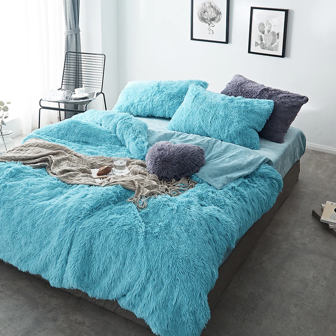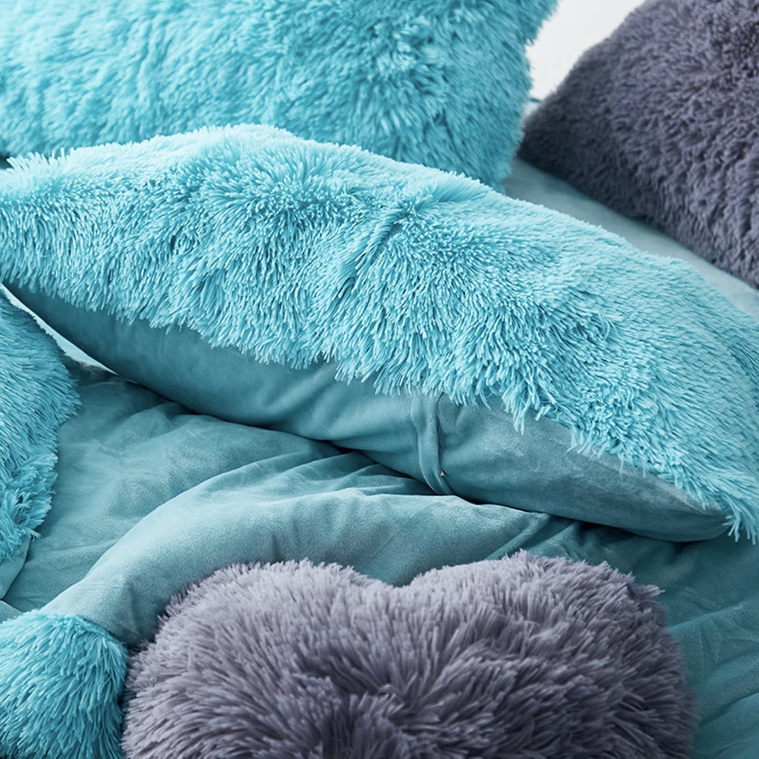 Cette parure de lit effet fourrure apportera de la chaleur à votre chambre et à vos nuits. Sa couleur bleu turquoise vous laissera rêveur d’horizons lointains et ensoleillés.