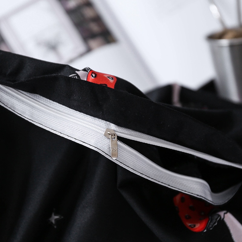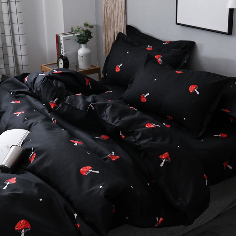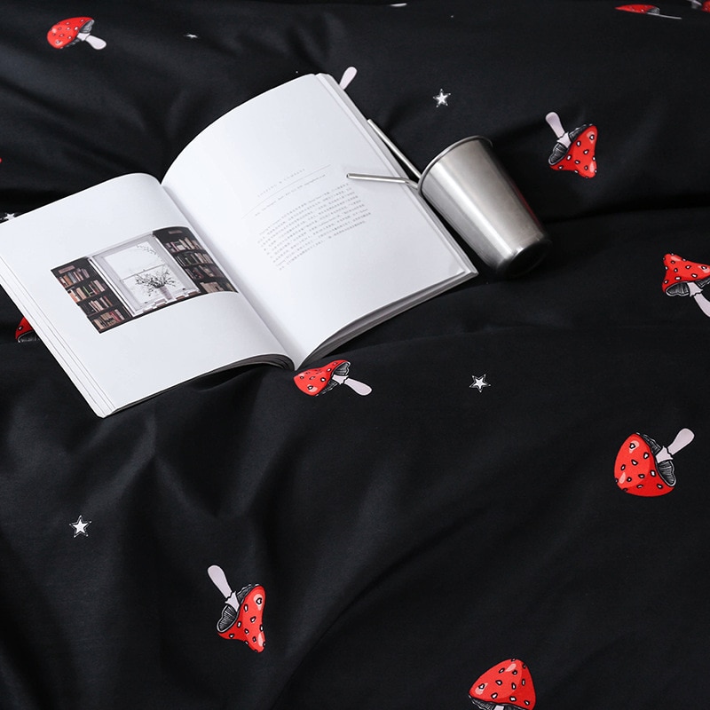 Amoureux des champignons, vous allez être ravie de cette parure de lit pourvue de millier de champignons rouges. Ils font ressortir le noir de cette parure et apportent une touche de mignonnerie à votre chambre.