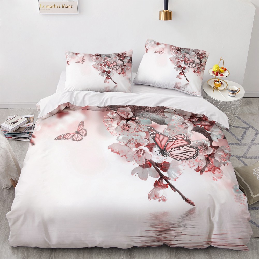 Une belle ambiance nature règnera dans votre chambre à coucher avec cette parure de lit à motif fleurs et papillons. Cette literie contribuera à transformer la pièce en véritable havre de paix.