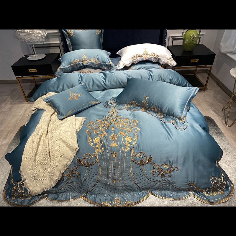 Une sublime broderie dorée pour une déco stylée et élégante. Choisissez cette parure bleue pour insuffler un esprit ethnique chic dans votre chambre à coucher.