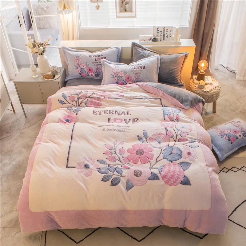 Posez cette parure de lit polaire avec motif fleur et inscription « Eternal Love » sur votre lit pour créer une ambiance romantique dans votre chambre en hiver. Non seulement enveloppante, cette parure de lit rose se montrera aussi apaisante afin de vous garantir des nuits douces et réparatrices durant les saisons froides.