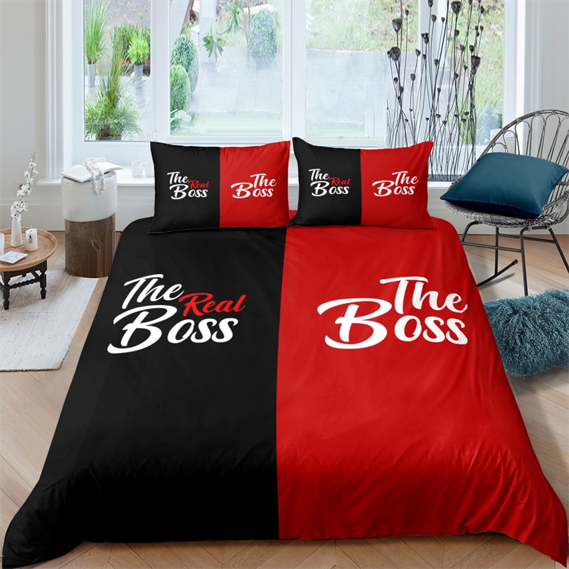 Le classique des couples: savoir qui est le ou la boss. Cela fait toujours sourire, alors cette parure de lit rouge et noire The Boss, pourra vous aider à débattre amicalement et décorer votre chambre en même temps. Chacun son côté avec cette inscription qui sonne comme une déclaration permanente à votre partenaire.