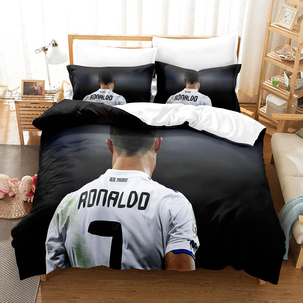 Apportez des vibrations de superstar à n’importe quelle chambre à coucher avec cette étonnante parure de lit comportant une photo de la star internationale du football Cristiano Ronaldo, vue de dos.