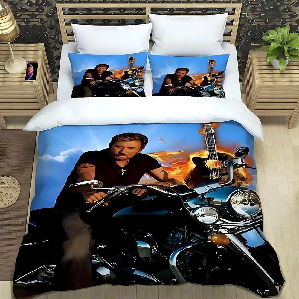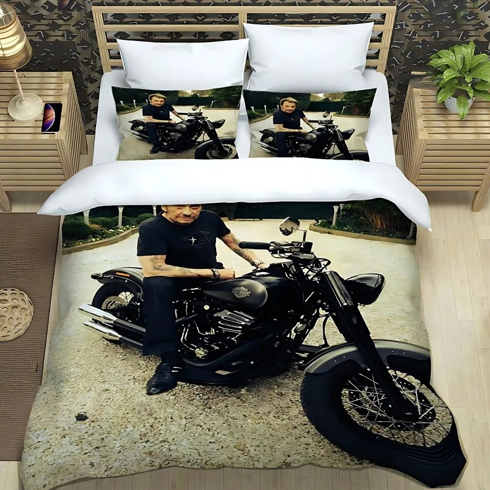 Affichez votre passion pour Johnny Hallyday avec cette parure de lit emblématique. Son design captivant met en scène le rockeur à moto dans des décors iconiques, rappelant son amour pour la liberté et l’aventure.