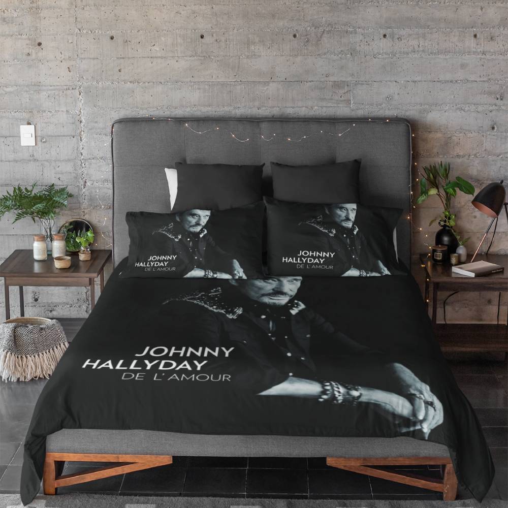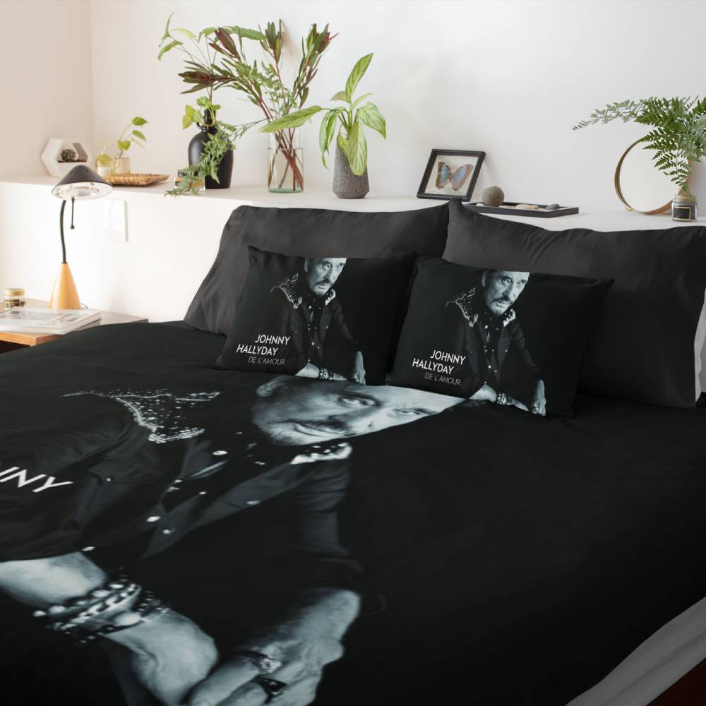 Plongez dans l’univers de Johnny Hallyday avec cette parure de lit d’une sobriété raffinée. La couleur noire, symbole de classe et d’intensité, met en valeur le portrait captivant de l’idole, accompagné du titre “De l’Amour”.