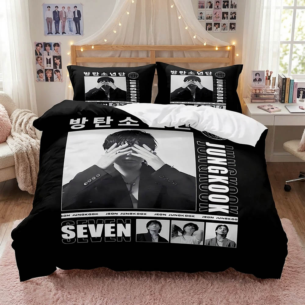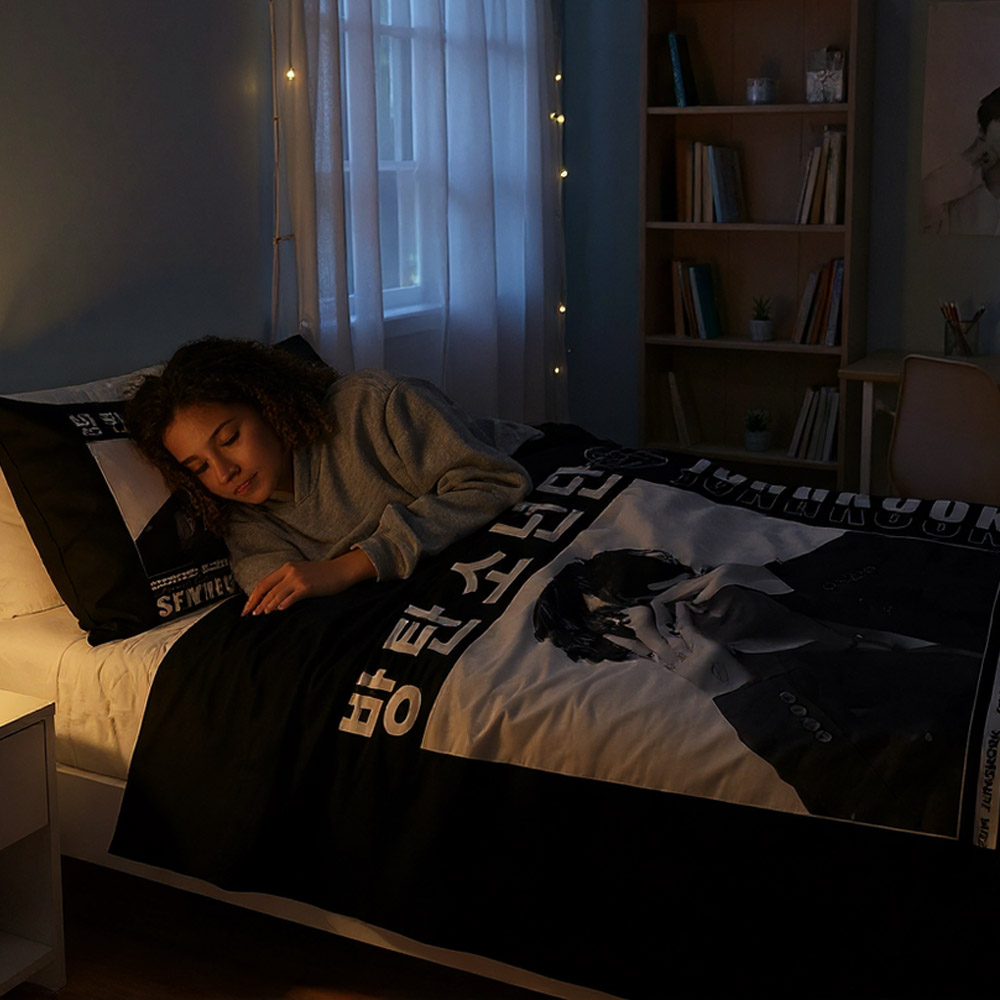 Cette literie exclusive célèbre le succès solo de Jungkook, illustrant sa transition vers une esthétique plus urbaine R&B. Le design capture l’énergie du clip et la prestance scénique de l’artiste.