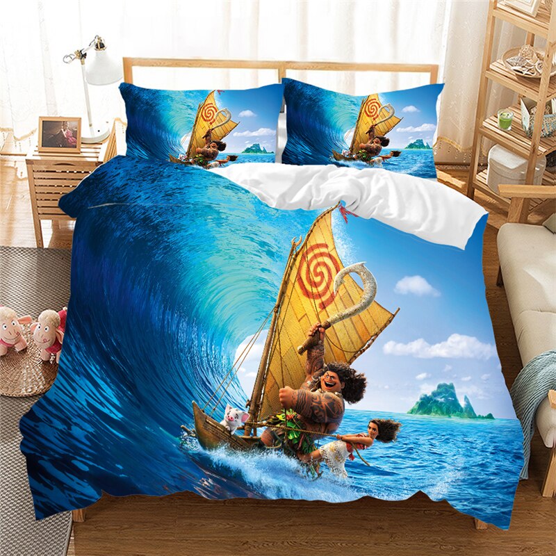 Une belle parure de lit bleue qui reflète les voyages de Moana et Maui sur les mers. Elle va apporter une touche de confiance et de liberté dans la chambre devotre enfant.